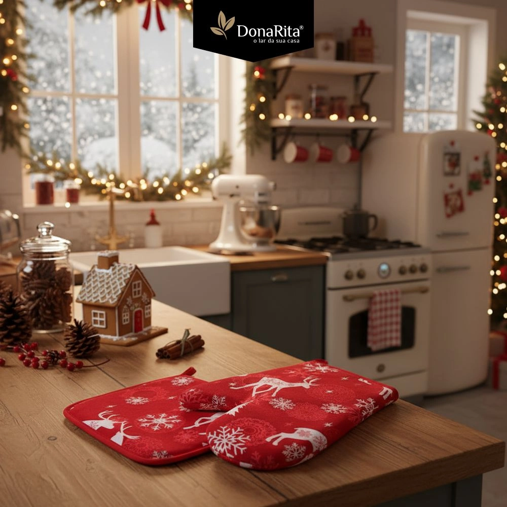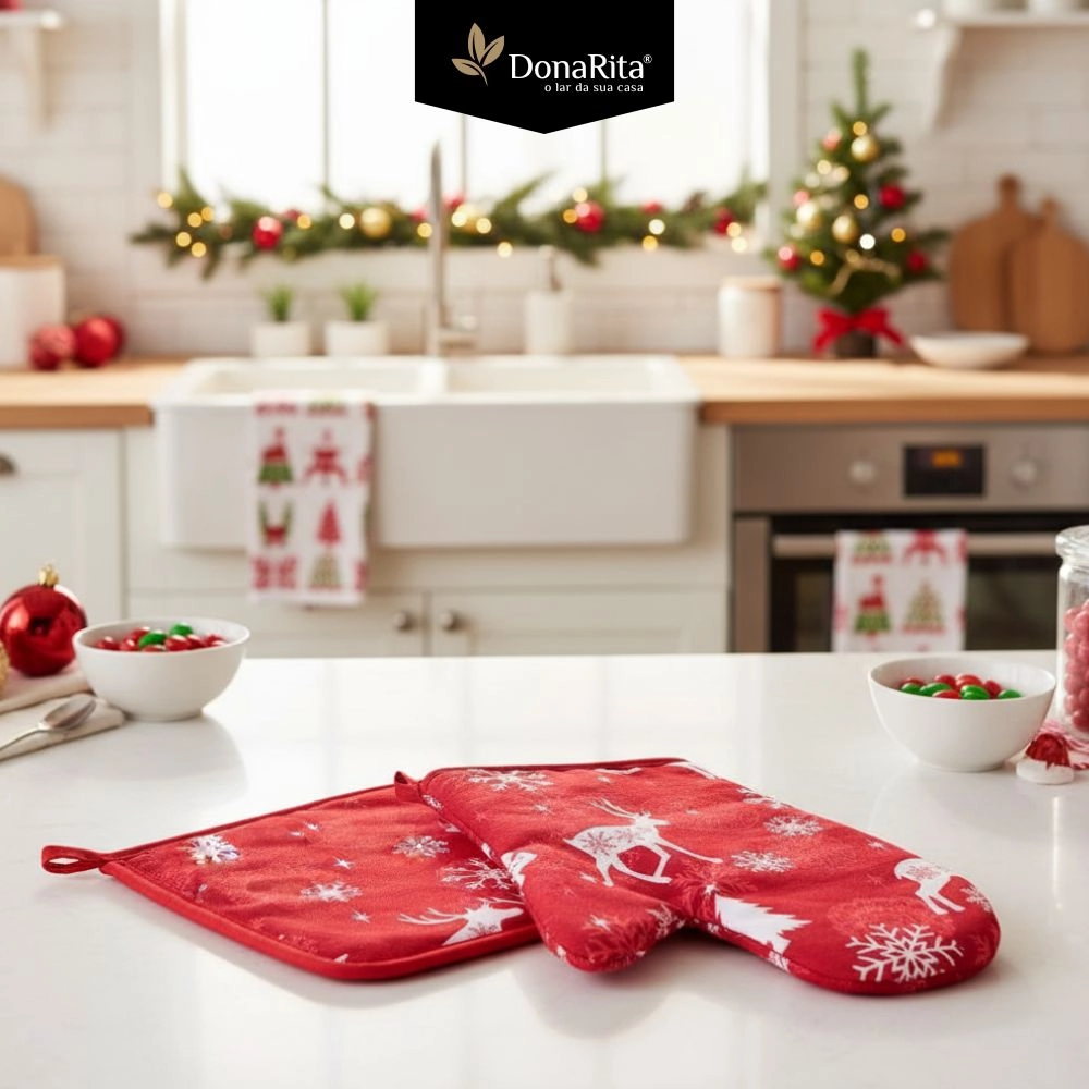 Conjunto de Luva e Pega Rudof. Conjunto com padrão natalício em tons de vermelho. Produto 100% algodão, Fabricado em Portugal pela LASA. Escolhido pela DonaRita, combina conforto e resistência num essencial para a sua cozinha. LASA, porque procuramos produtos de têxteis-lar que unem inovação, conforto e sustentabilidade. Com mais de 40 anos de experiência e presença global. A LASA é uma marca portuguesa de referência, que aposta na excelência da confeção, na inovação tecnológica e na responsabilidade ambiental.