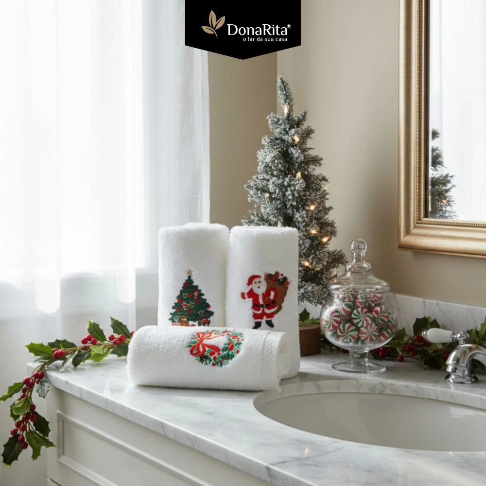 Conjunto de Toalhas de Mãos. Um conjunto de três toalhas de mãos de Natal, com bordados natalícios. Tecido 100% algodão, 500gr e dimensões 30x30cm. Fabricado em Portugal, pela LASA. Escolhido pela DonaRita, oferece suavidade e conforto para o seu espaço de banho. Lasa, porque procuramos produtos de têxteis-lar que unem inovação, conforto e sustentabilidade. Com mais de 40 anos de experiência e presença global, a LASA é uma marca portuguesa de referência, que aposta na excelência da confeção, na inovação tecnológica e na responsabilidade ambiental.
